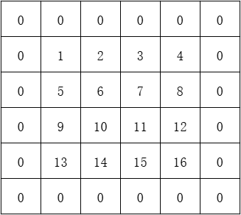 在上面的例子中,我们无法计算图像边缘的像素,如果我们想计算边缘像素,可以使用填充的方法(Padding),对图像周围填充0,然后进行计算。
