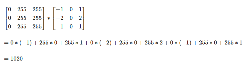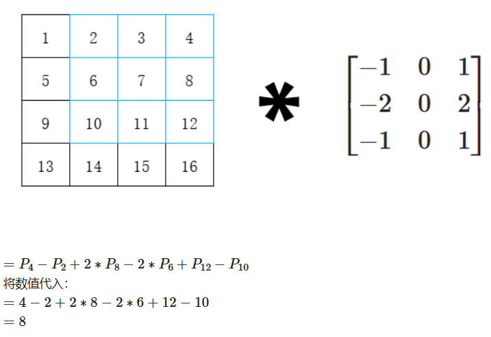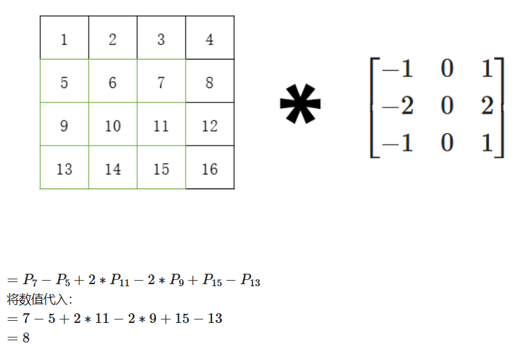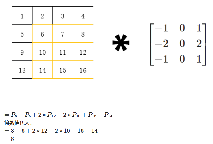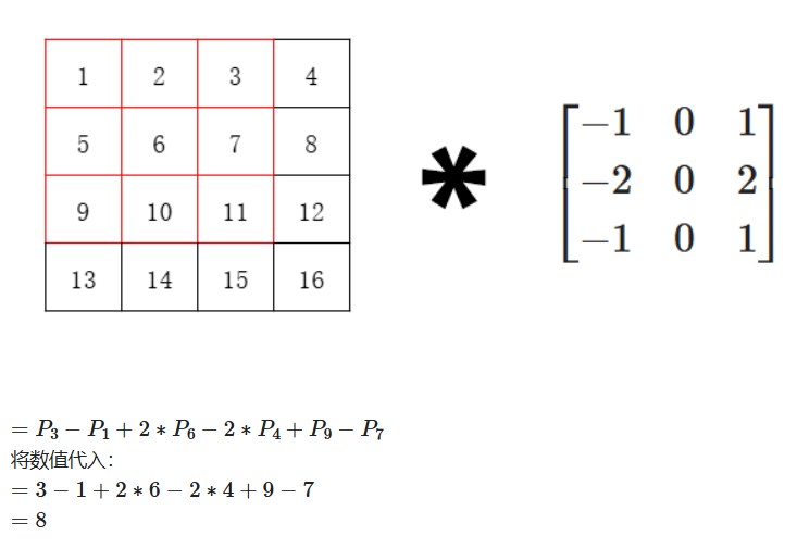 第一步:计算红框部分像素分别与Sobel算子(卷积核)相乘然后求和: