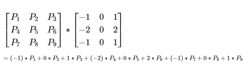 现在要计算像素5(P5)x轴方向的梯度,则将像素矩阵乘以x方向的Sobel算子: