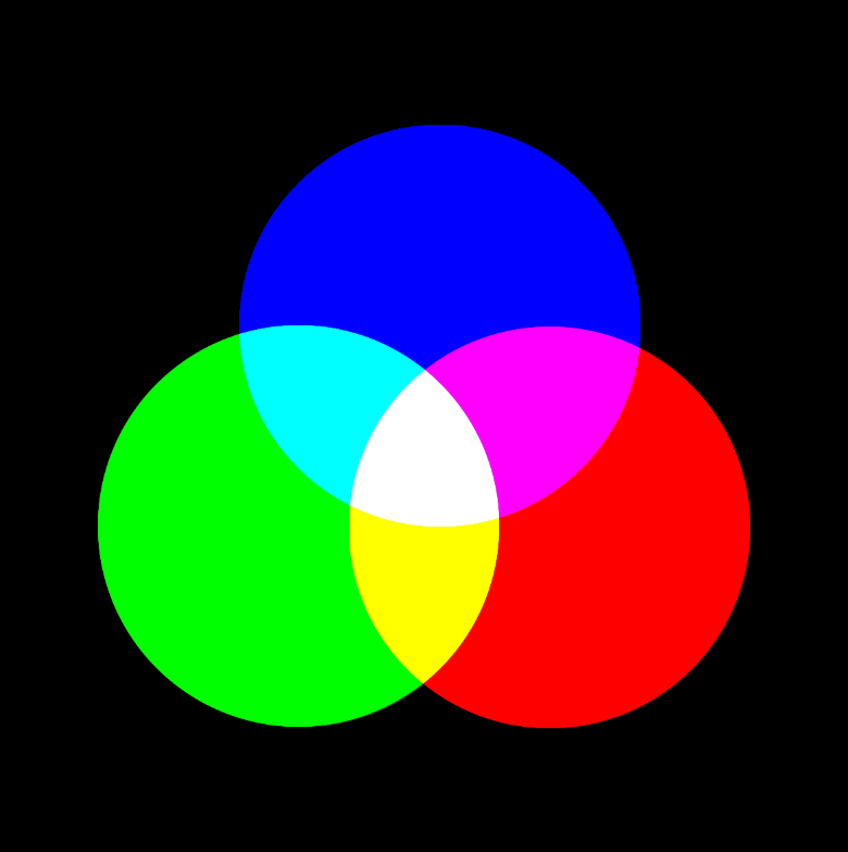 RGB重叠部分为白色(想象没有点亮像素时,屏幕是黑色)