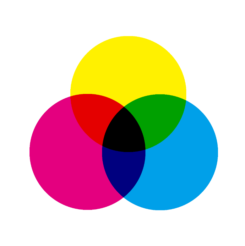 CMY重叠部分为黑色(想象纸张为白色,涂的墨水越多,印刷颜色越深)