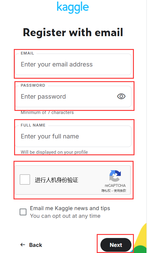 1.3 输入邮箱,密码,姓名,然后进行人机身份验证,然后点击“next”