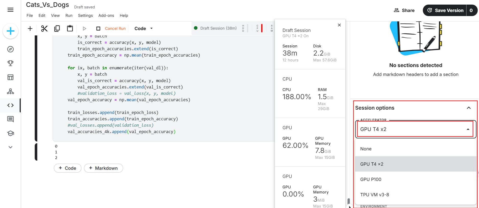 点击右侧“Session options”下方的“Accelerator”,其中None为无加速,使用CPU计算;T4 x2为使用两张英伟达Tesla T4加速,P100为使用英伟达Tesla P100加速,TPU"Tensor Processing Unit"为张量处理单元,通常速度更快,但需要代码对TPU进行优化,推荐使用T4 x2进行加速。