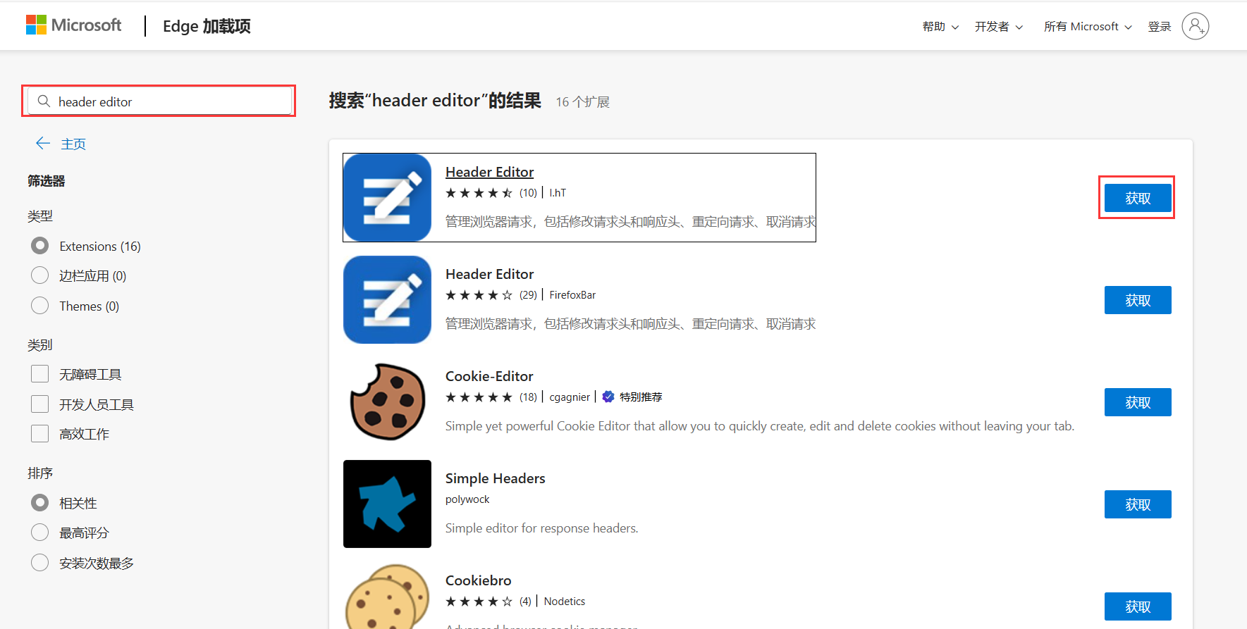 打开Microsoft Edge 加载项商店,搜索:header editor