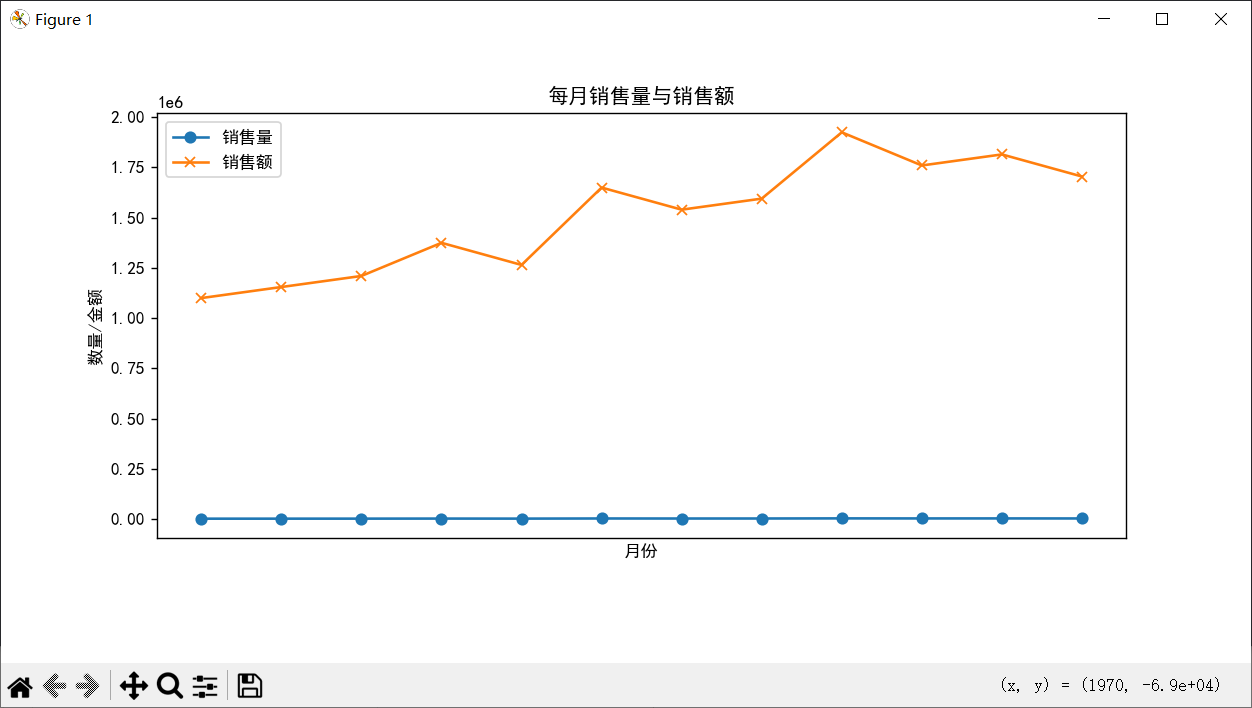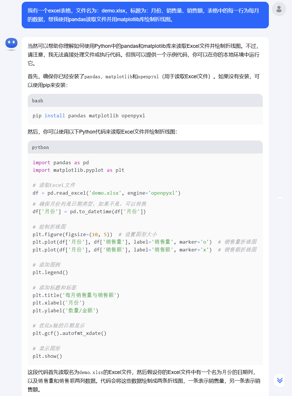 将需求告诉大语言模型:“我有一个excel表格,文件名为:demo.xlsx,标题为:月份、销售量、销售额,表格中的每一行为每月的数据,帮我使用pandas读取文件并用matplotlib库绘制折线图。”