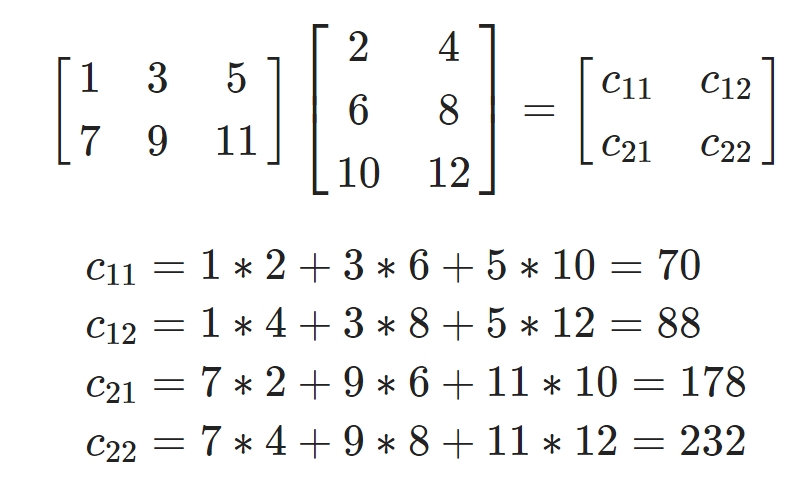 假设矩阵A是一个2行 x 3列的矩阵,矩阵B是一个3行 x 2列的矩阵,矩阵A乘以矩阵B得到结果矩阵C: