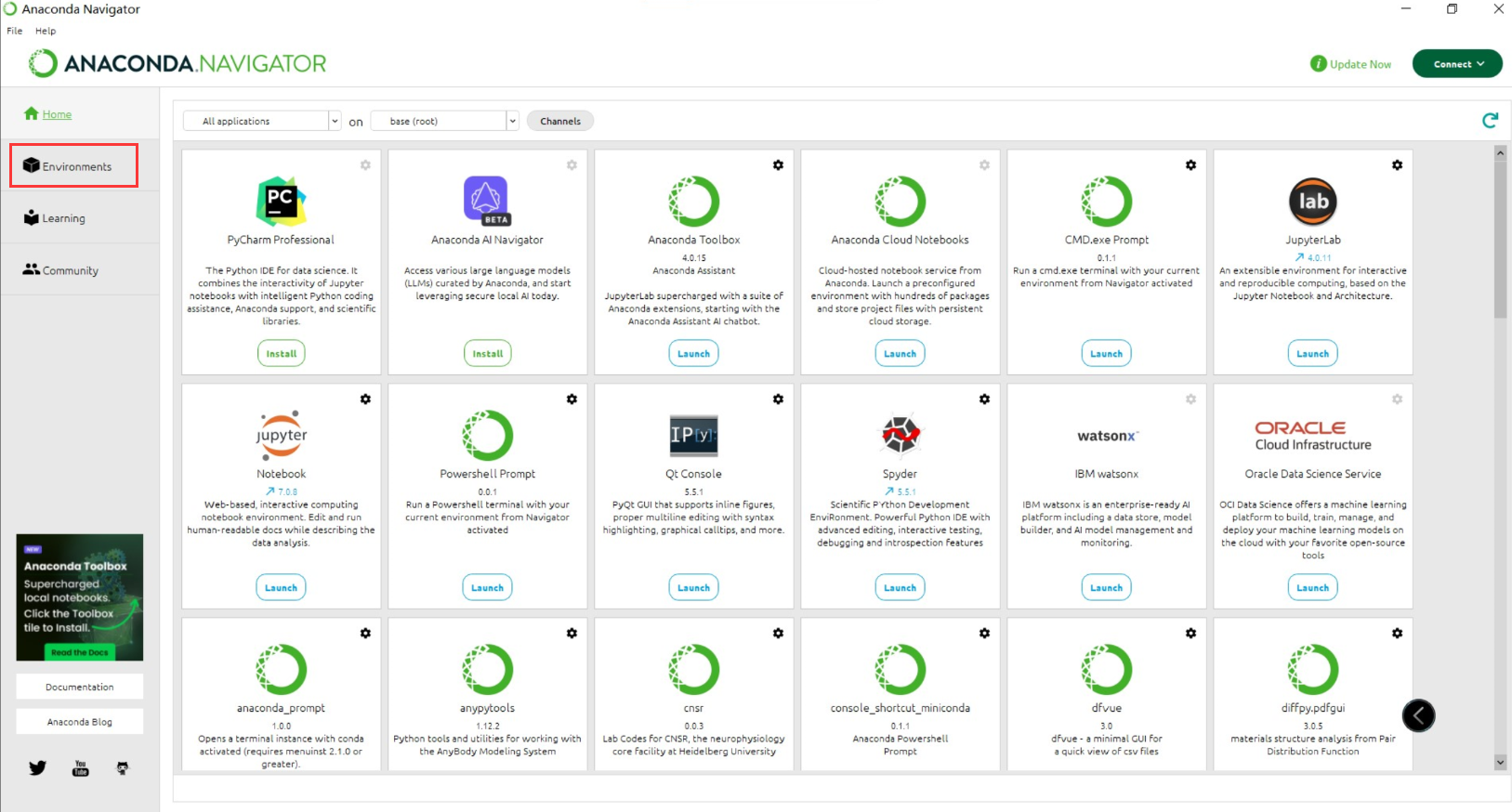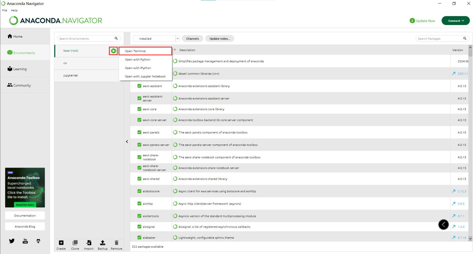 点击base(root)(基础环境,conda命令安装在基础环境中),进入conda基础环境
