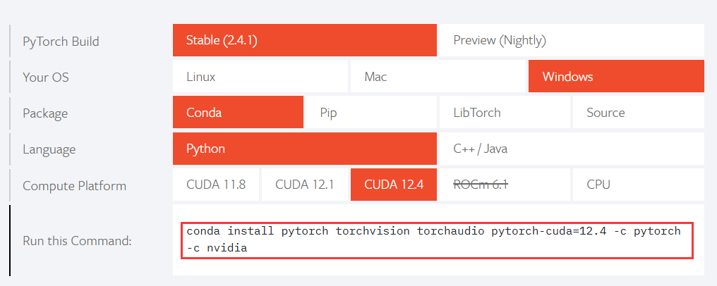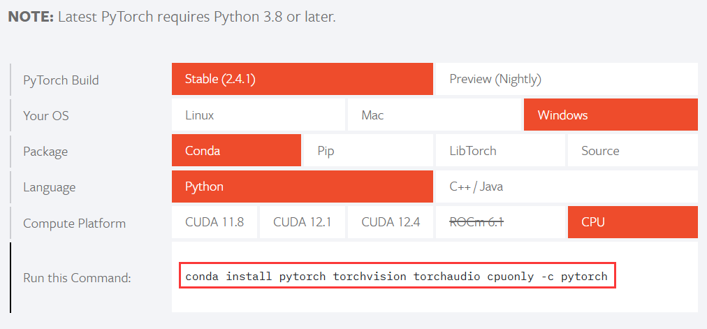 按如图所示选择,复制图中命令:conda install pytorch torchvision torchaudio cpuonly -c pytorch
