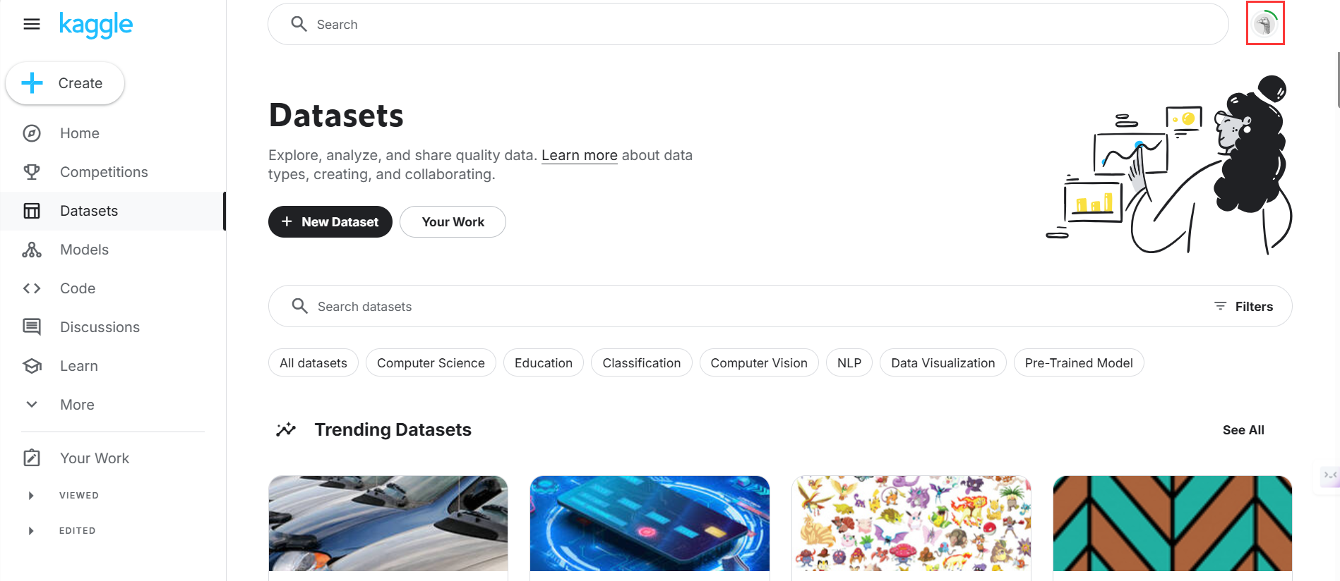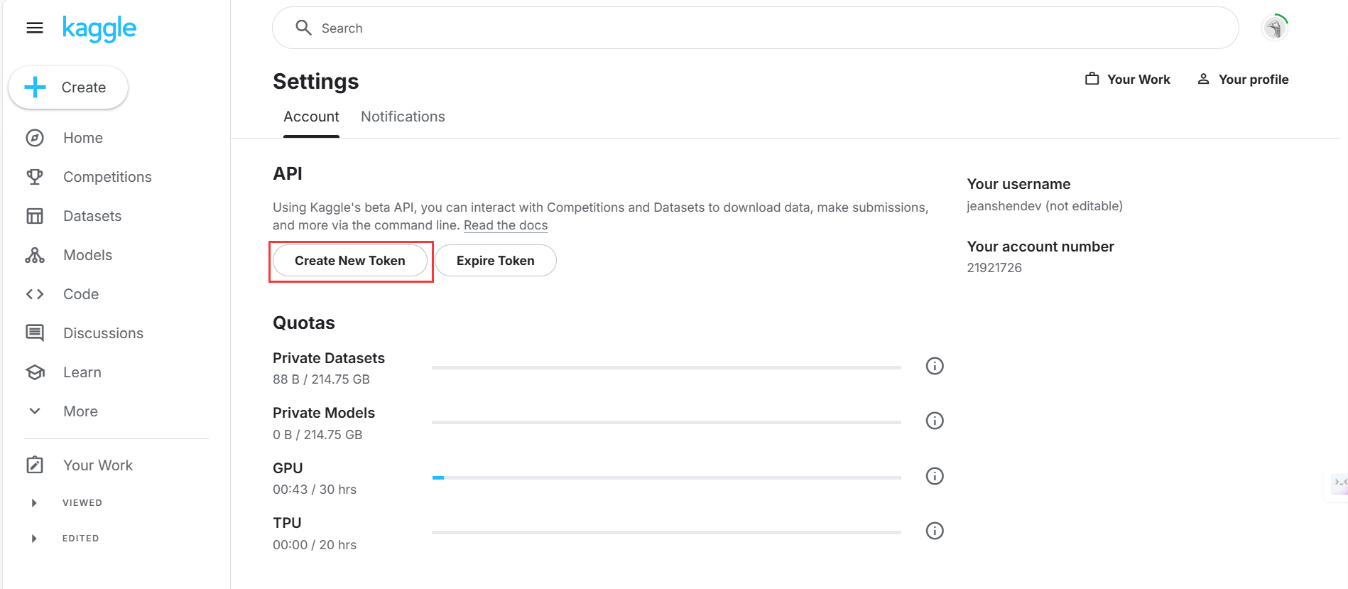 点击“Create New Token”会自动下载一个kaggle.json文件,里面包含了登录密钥