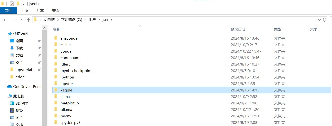 3、在用户目录下创建“.kaggle”文件夹(注意前面有个“.”),然后将刚刚下载的kaggle.json文件复制到这个文件夹下
