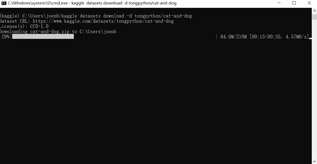 4、即可在命令行中使用kaggle命令下载数据集:kaggle datasets download -d tongpython/cat-and-dog